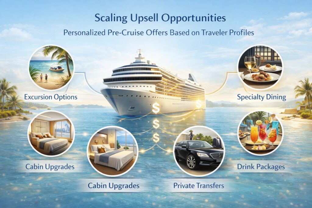 Recommends excursions, cabin upgrades, specialty dining, beverage packages, transfers, and add-ons based on traveler intent—executed during live conversations, not deferred to follow-up.