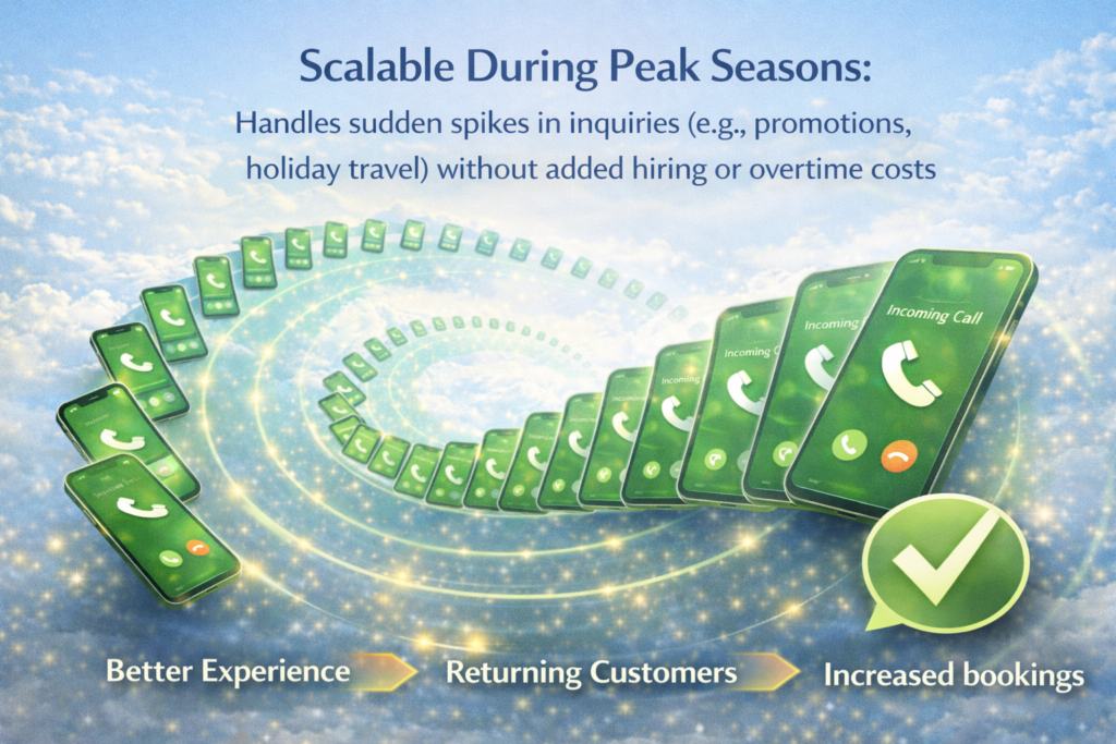 Absorbs inquiry surges during promotions, holiday periods, and peak booking windows without added hiring, overtime, or service degradation.